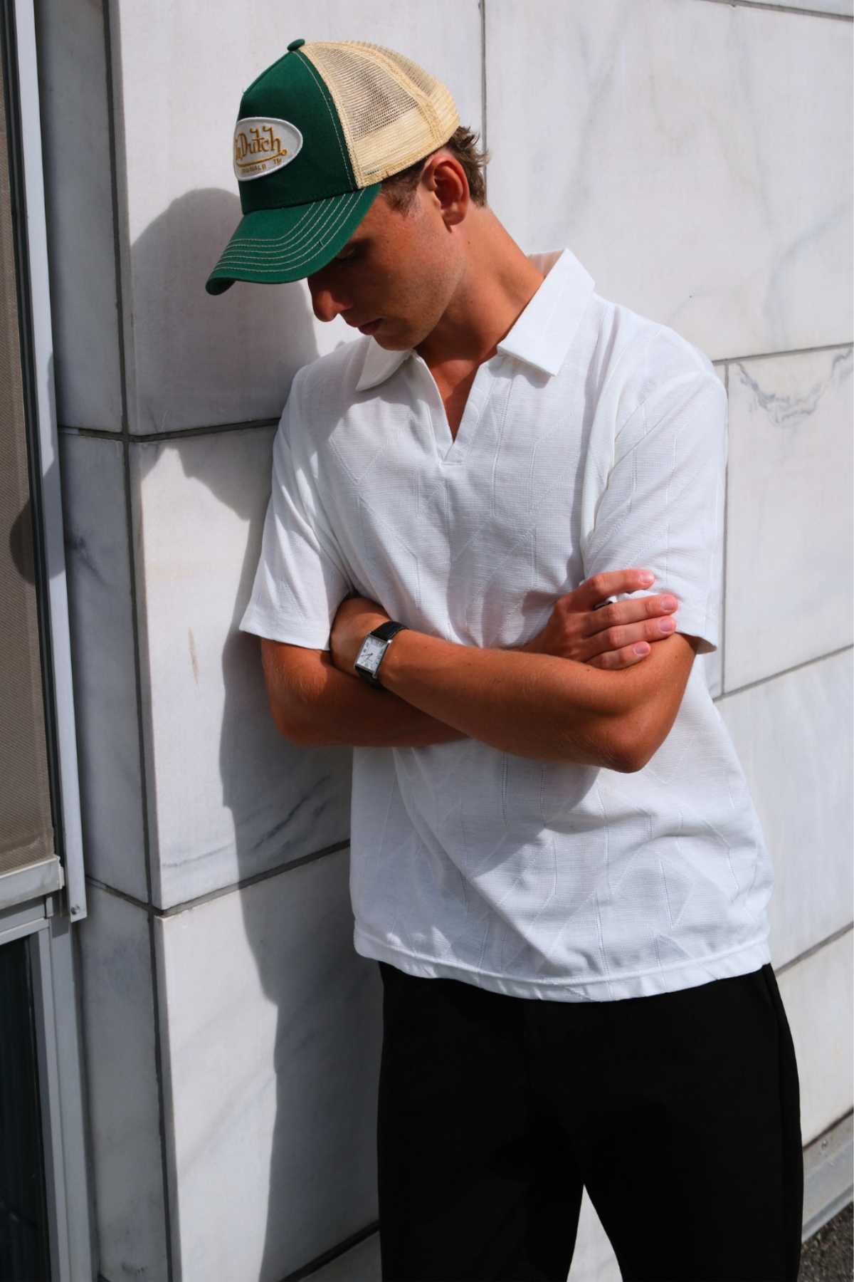 Was den Atlas Polo auszeichnet, ist das markante strukturierte Gewebe. Es's Ein subtiles, ausgefeiltes Detail, das dem knusprigen weißen Stoff Tiefe und Dimension verleiht, das Licht fängt und das Auge zeichnet. Dies ist kein lautes Muster; Es's Eine ruhige Aussage von Qualität und Liebe zum Detail. Die reiche Textur erhöht das gesamte Kleidungsstück und verwandelt es von einem einfachen Grundnahrungsmittel in ein Premium -Stück, das sich so gut anfühlt, wie es aussieht. Es's Die Art von Hemd, die Komplimente verdient und Sie sich zuversichtlich fühlen, sobald Sie es anziehen.