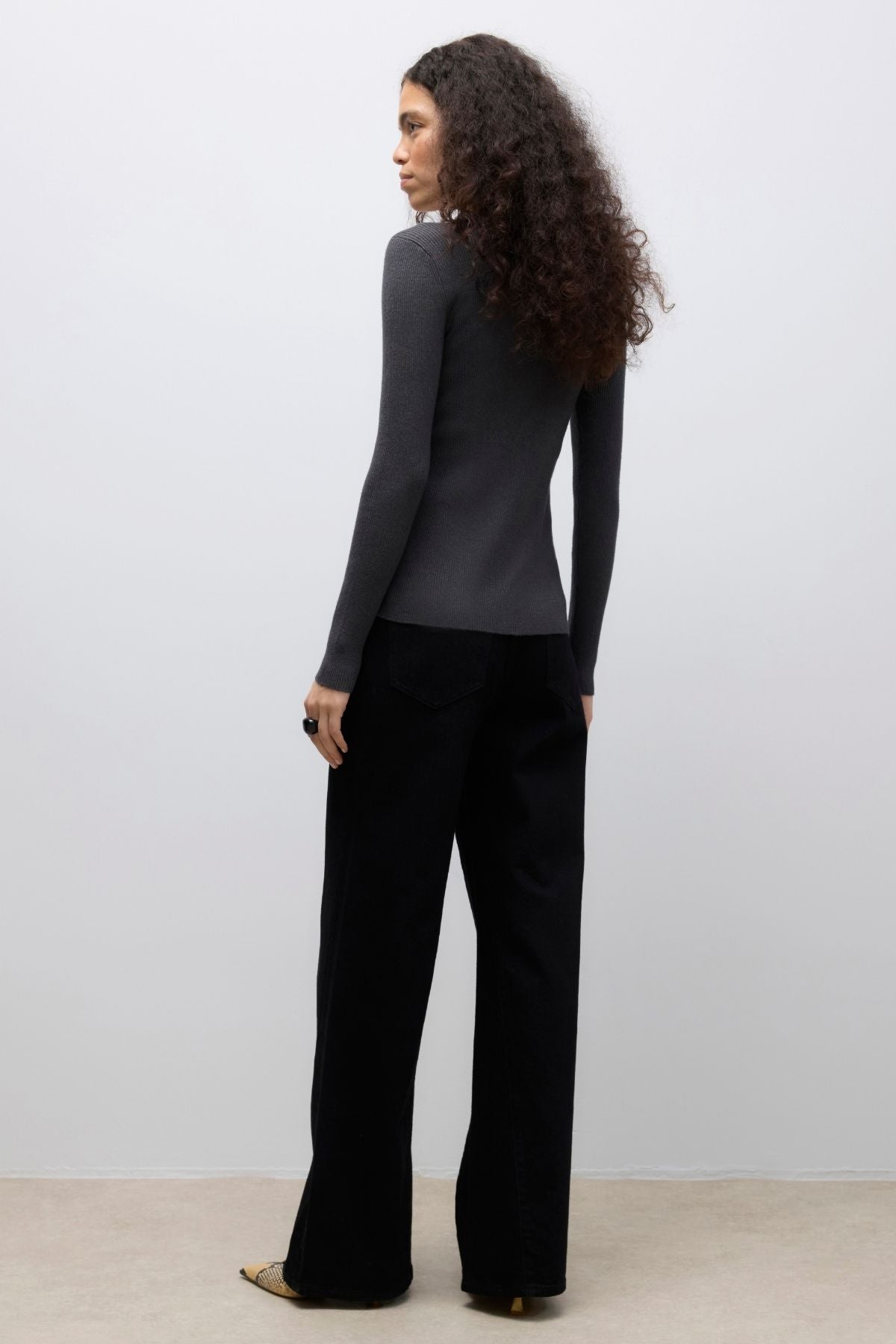 Raffiniertes Melange -Strick: Das dunkelgraue Melange -Gewebe verleiht diesem wesentlichen Stück visuelle Textur und eine schicke, moderne Note.