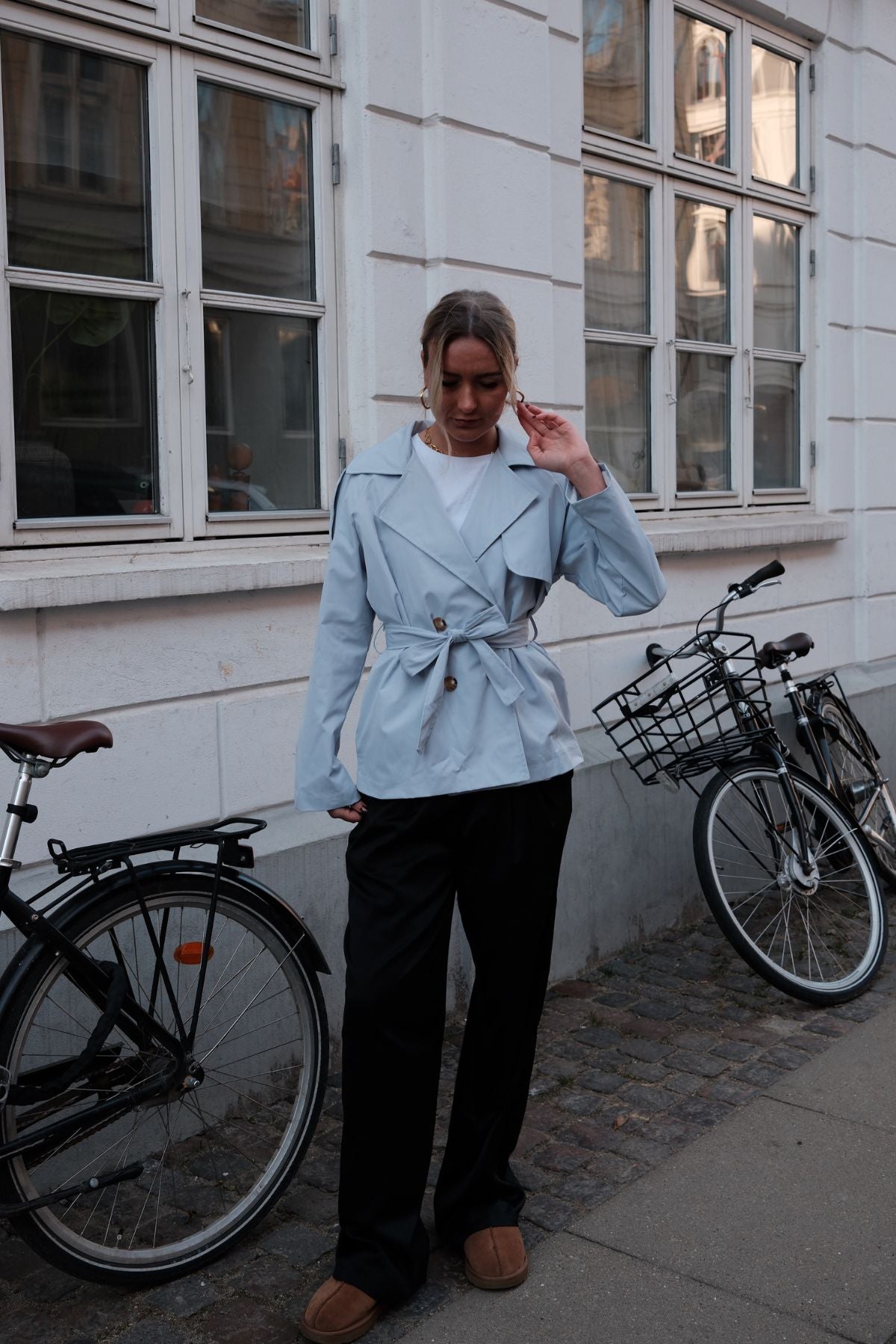 Was den Sia Short Trenchcoat auszeichnet, ist seine unglaubliche Vielseitigkeit. Die verkürzte Länge verleiht im Vergleich zu herkömmlichen Modellen eine dynamischere und jugendlichere Ausstrahlung und ermöglicht mehr Bewegungsfreiheit. Für einen eleganten Büro-Look drapieren Sie es über ein strahlend weißes Hemd und passen es maßgeschneidert an Pants. Wenn Sie sich auf den Weg zu einem entspannten Wochenendbrunch machen, kombinieren Sie es mit Denim in Used-Optik und Ihren Lieblings-Sneakern für einen Look, der schick ausstrahlt, ohne es überhaupt zu versuchen. Die zweireihige Vorderseite und die Gürteldetails ermöglichen es Ihnen, Ihre Taille für eine definiertere Silhouette zu betonen oder sie für einen mühelosen, entspannten Look offen zu lassen.